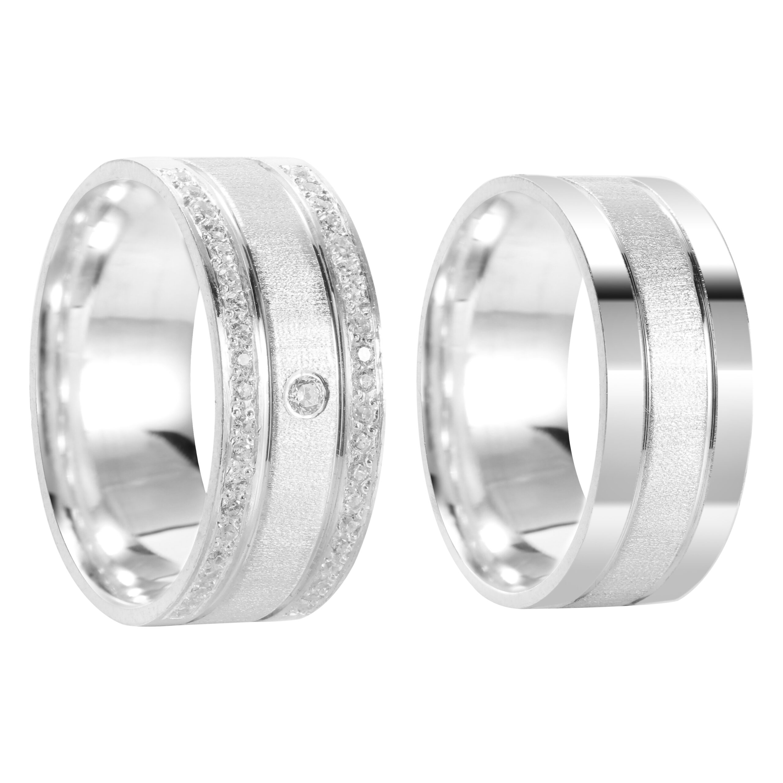 As alianças AL49 trazem um visual moderno e marcante: acabamento reto, faixa fosca na área central, dois frisos laterais e, para completar, uma pedra central de maior destaque acompanhada por laterais totalmente cravejadas de zircônias. Um modelo luxuoso, brilhante e cheio de personalidade. ✨